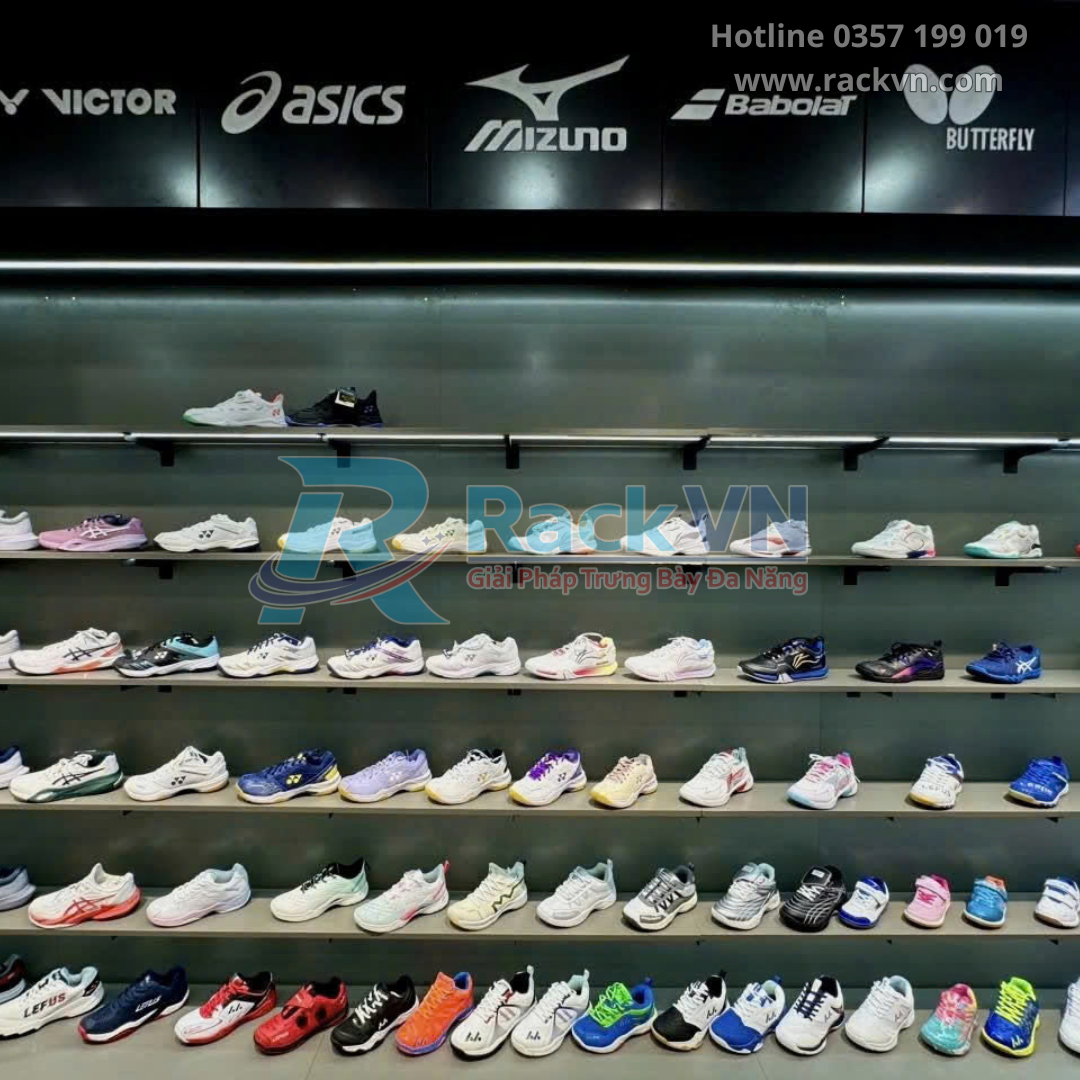 Giày thể thao là một trong những nhóm sản phẩm có khả năng tạo doanh thu cao, vì vậy khu vực này được đầu tư kỹ lưỡng. RackVN sử dụng kệ trưng bày giày thể thao kết hợp tay đỡ gắn trên hệ rãnh, tạo thành các tầng trưng bày rõ ràng và dễ quan sát.