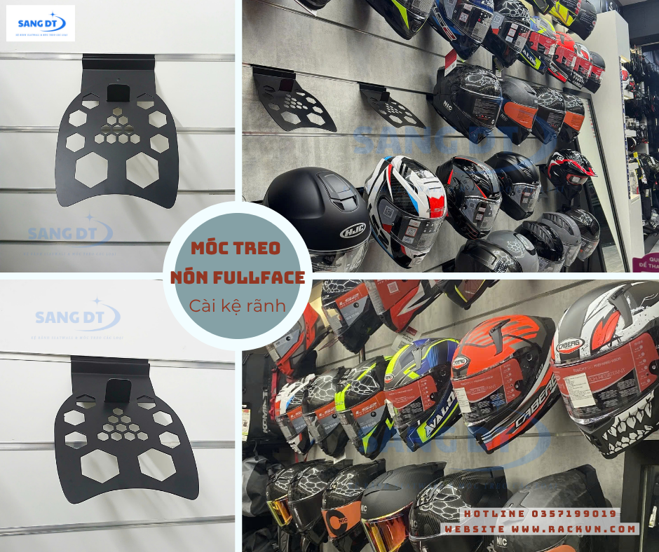 Setup nón fullface bằng móc treo nón chuyên dụng cài kệ rãnh của RackVN
