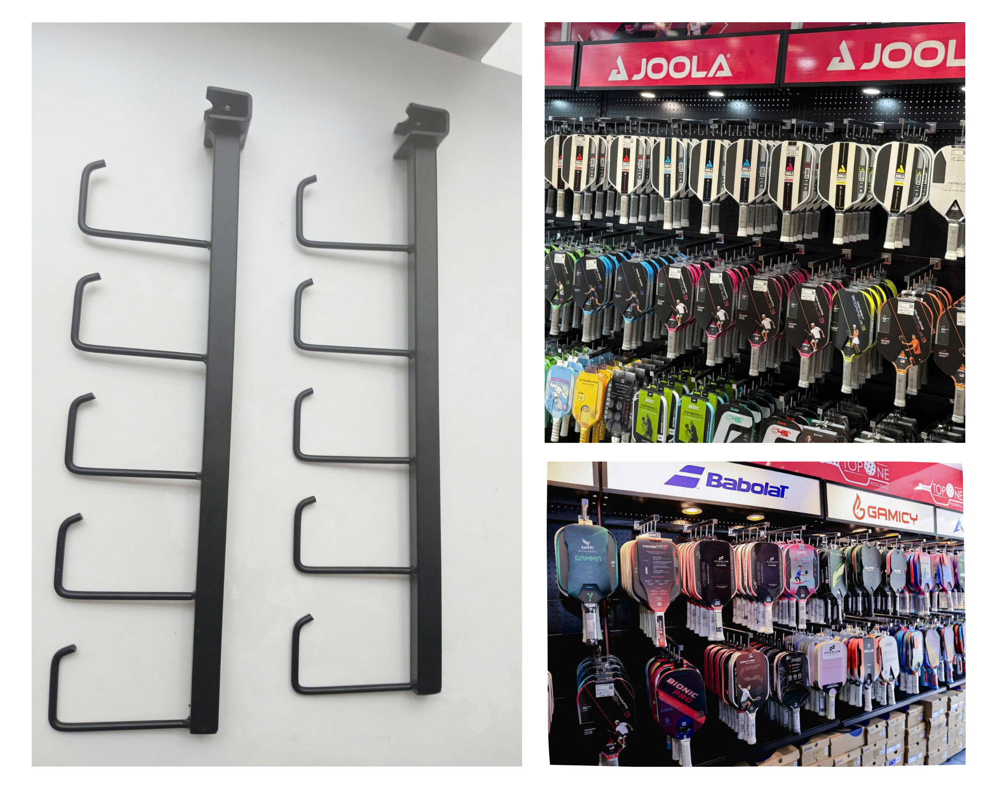 Vợt pickleball: Ngoài móc treo chuyên dụng cho loại vợt này thì những loại bao bì có lỗ treo trưng bày bằng móc râu giúp gia tăng số lượng trưng bày. Thay vì chỉ treo được tối đa 2 vợt cho móc chuyên dụng.